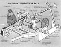 The two uprights are welded to opposite ends of a pipe brace; the jack shafts are slipped through the bearings and held fast with retaining collars. This entire assembly is mounted in the frame by means of simple mechanical pivots.