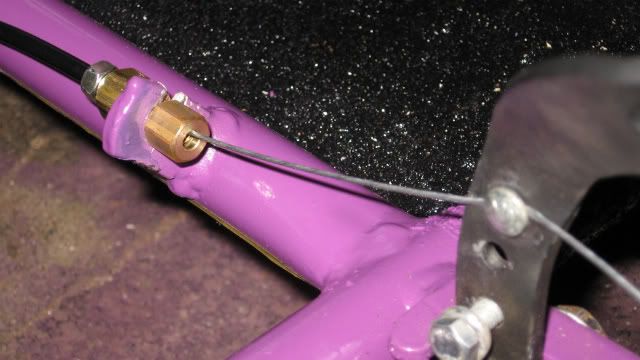 Regarding adjusters, it's fairly simple to make one. Go and get say, a 1/4-20 bolt from the hardware store. Cheap s**t, non-graded. Drill a hole lengthwise all the way through it for the cable to run through. Find a drill bit the size of the OD of the cable sheath (or "conduit"), and on the head side of the bolt, open up the cable hole about halfway the thickness of the bolt head. The sheath will sit in the recess you created. Now, weld a tab on your frame in the required place and drill and tap to match the bolt. If you are unequipped to tap threads, you can just drill a plain hole, and install nuts on both sides of the bolt to tension your cable. I have made many of these, with full success.